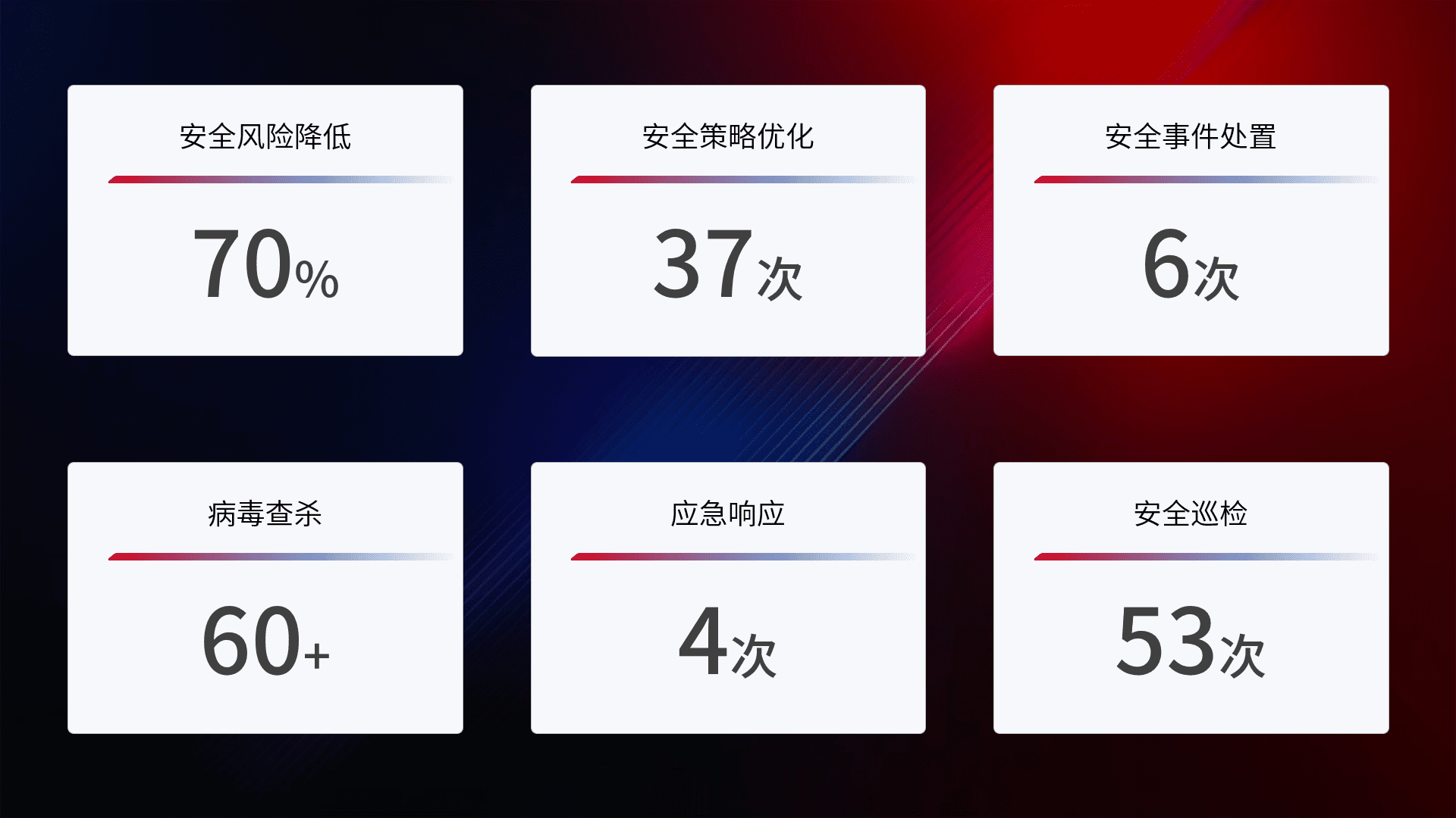 提供全面的安全事件报告体系,,,,包括处置报告、、周报、、、、季度和年度总结,,结合持续监控,,,,帮助客户深入了解网络安全状况。。。。